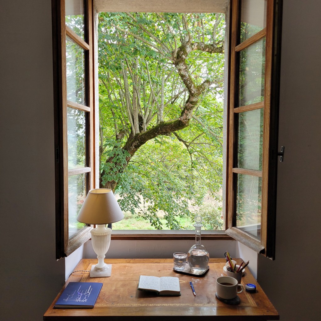 On the next morning, I do exactly this – even before breakfast I take my small notebook that I always carry with me when travelling and with a very careful handwriting I start to describe my last days in France: the journey, the view from my hotel room of the rooftops of Paris, the indigestion after the traveling, the sun, the streets the crowds and seeing the Mona Lisa at 9 am on the Sunday morning. Then Toulouse and the hotel receptionist handing me an old-fashioned printed city map highlighting a route for sightseeing and recommending good places to eat. The hotel room with the roof window, the city at the dawn, the beauty of the architecture, the people spending the time outside and enjoying the evening, the view on the Pont Neuf by night. I keep on writing for several hours, until the lunchtime. I write to memorise the last days additionally to the pictures I took but also to adjust to the place I will spend the following week. I need to slow down my thoughts and focus. I need to change my perception from the quantity of impressions to the smaller number of events and places but more intensity and quality in terms of the famous being here and now. I am surrounded by furniture and items made of precious materials, all of which have been carefully collected to decorate the old, beautiful house. When I write, I look through the open window at the big old tree in the garden. I fuel myself with its beauty and the grace of the nature. It calms and helps to declutter my mind. Reminds myself what really matters, simply by its presence.